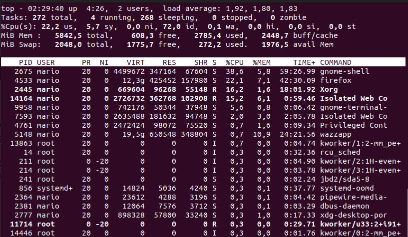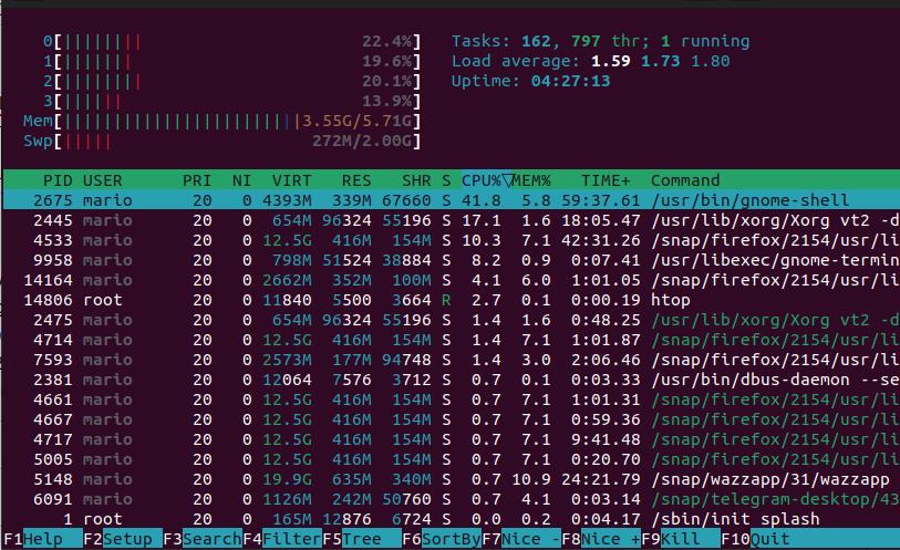 Secara umum, perintah top atau htop adalah pilihan paling populer untuk memantau sumber daya sistem. Dengan perintah tersebut kita dapat mengidentifikasi penggunaan CPU mesin. htop sendiri fungsinya sama seperti perintah top, hanya saya htop output atau tampilannya lebih canggih.