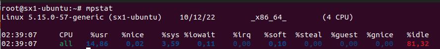 Perintah mpstat adalah perintah yang digunakan untuk menampilkan statistik terkait prosesor dan menampilkan statistik penggunaan CPU sistem, dan juga dapat menampilkan informasi tentang pemanfaatan dan kinerja CPU.