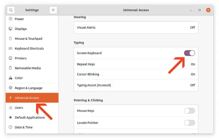 b. Pilih Universal Access lalu aktifkan Screen Keyboard-nya